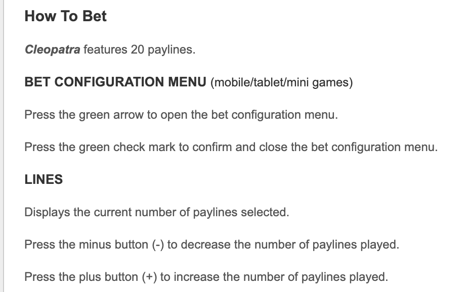 Utiliza la versión gratis de la tragamonedas Cleopatra para comprobar su configuración. Esto es importante porque dependiendo del casino, Cleopatra se ofrece también con sólo 3 líneas y hasta 25 líneas de pago y 4 opciones de jackpot progresivos, en la que es la versión de las versiones lanzada IGT, con el nombre de Cleopatra MegaJackpots. Pero la mayoría de variantes gratis de tragamonedas Cleopatra tienen un total de 20 líneas seleccionables, de las que puedes activar 1, 5, 9, 15 o 20 líneas por tirada.
