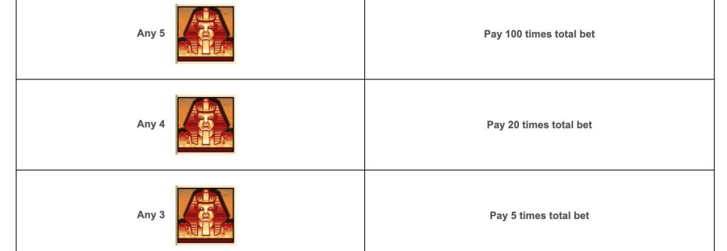 | Símbolo Scatter | Esfinge (activa tiradas gratis) |