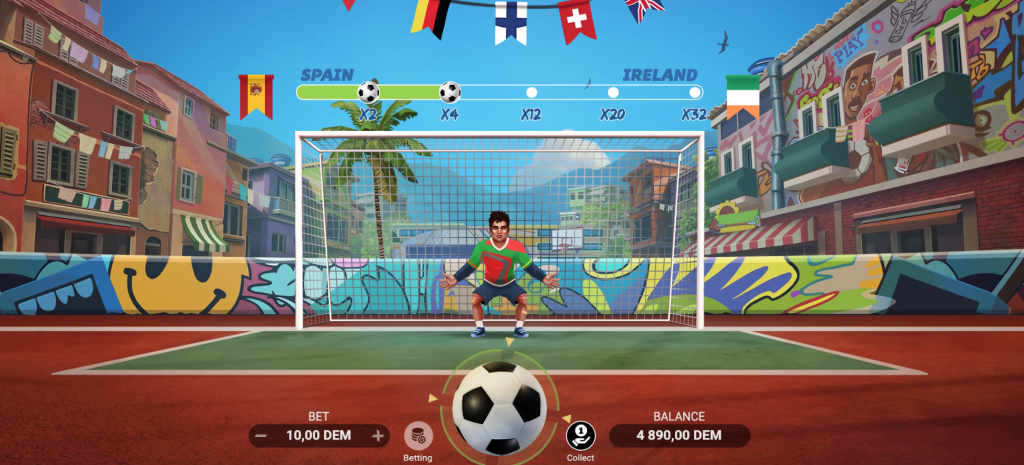 Penalty Shoot-Out Street es un juego de tragamonedas desarrollado por una de las principales compañías de software de casino. El juego está ambientado en un entorno urbano, donde los jugadores participan en emocionantes tandas de penaltis para ganar premios. La combinación de gráficos de alta calidad, efectos de sonido realistas y una mecánica de juego atractiva hacen de este slot una opción popular entre los jugadores. Los usuarios pueden interactuar con la interfaz del juego haciendo clic para seleccionar un país, configurar la apuesta y realizar disparos en la portería.